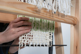 The main topic of this project „loom_lab“ was working with the V-loom (created by Sybille Carstens, Casmue GbR). A loom that is especially developed to weave/ knot in 3 dimensional objects or yarns.