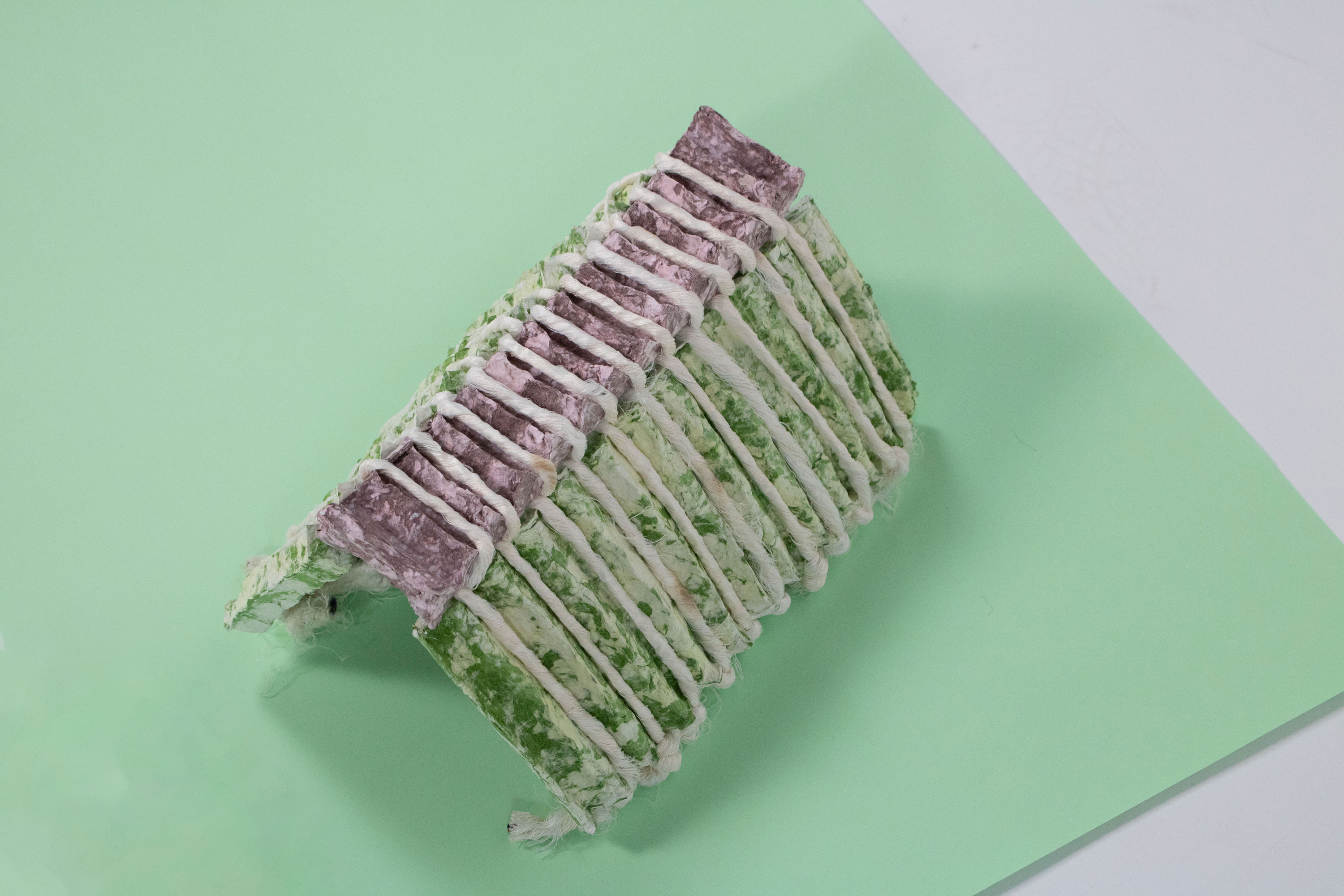 The blocks are made of used cotton, old sketching paper and starch glue.The yarn is made of cotton, and follows the fold form of the blocks elegantly, whilst holding it tightly in its structure.The form can be customized, so other materials could also be thinkable.Since the scale of the prototype is rather small, a Clo3D model of the room divider was created, to show its actual size in e.g. working spaces.